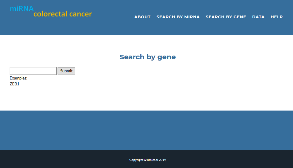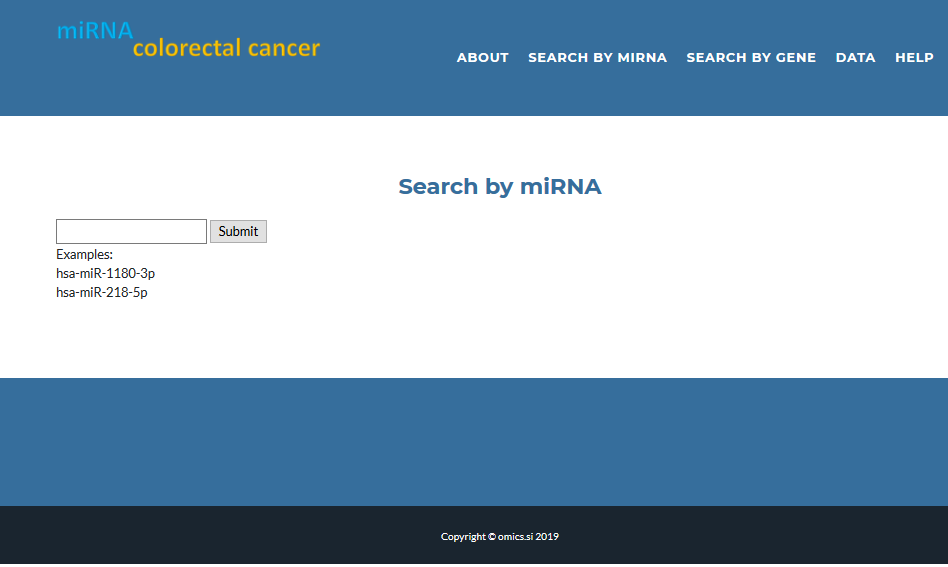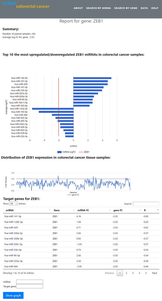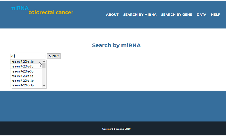 or start typing and then select miRNA name from list of values to find more about miRNA and their target gene expression in colorectal cancer: